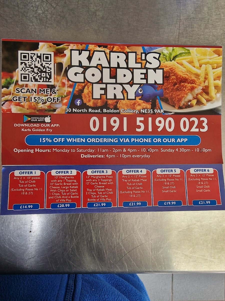 The menu at Karls Golden Fry offers a diverse selection of dishes, ensuring there's something for everyone. The Parmesan options are a highlight, featuring classics like Chicken Parmesan and Bolognese Parmesan, along with a customizable Create Your Own Parmesan. For those with a sweet tooth, the Desserts and Cakes section includes indulgent choices such as Tennessee Toffee Cake, Chocolate Fudge Cake, and Strawberry Cheesecake. A variety of drinks are available, including Sprite, Dr Pepper, and Coca-Cola in 0.33l bottles. The Special Offers menu also provides multiple combo options, such as Offer 1 through Offer 5. Pizza lovers can enjoy a selection of sizes and flavors, from the 10" Margherita to the 12" Salami, with the option for a Half & Half Pizza. For a flavorful bite, the Garlic Breads like the 10" Red Devil Garlic Bread or the cheesy 10" Garlic Bread with Cheese are great choices. The Kebabs section includes hearty options like the Large Chicken Tikka Kebab and Mixed Kebab, as well as Tray of Kebab Meat. If you're in the mood for something wrapped, the Kebab Wrap and Chicken Tikka Wrap are flavorful options, with or without cheese. The American Burgers range from a Quarter Pounder Cheeseburger to the Half Pounder Chilli Burger, offering something for all burger enthusiasts. For dessert, Ben & Jerry's Ice Cream in flavors like Fudge Brownie and Cookie Dough offers a sweet ending to your meal. The menu also features hearty Fish & Chips, Southern Fried Chicken, and a variety of Side Orders like Pitta Salad and Tray of Salad. For a quick lunch, the Lunchtime Specials include options like Pizza Slice & Chips or Chicken Nuggets & Chips. Overall, Karls Golden Fry delivers an extensive, satisfying menu to cater to every craving.